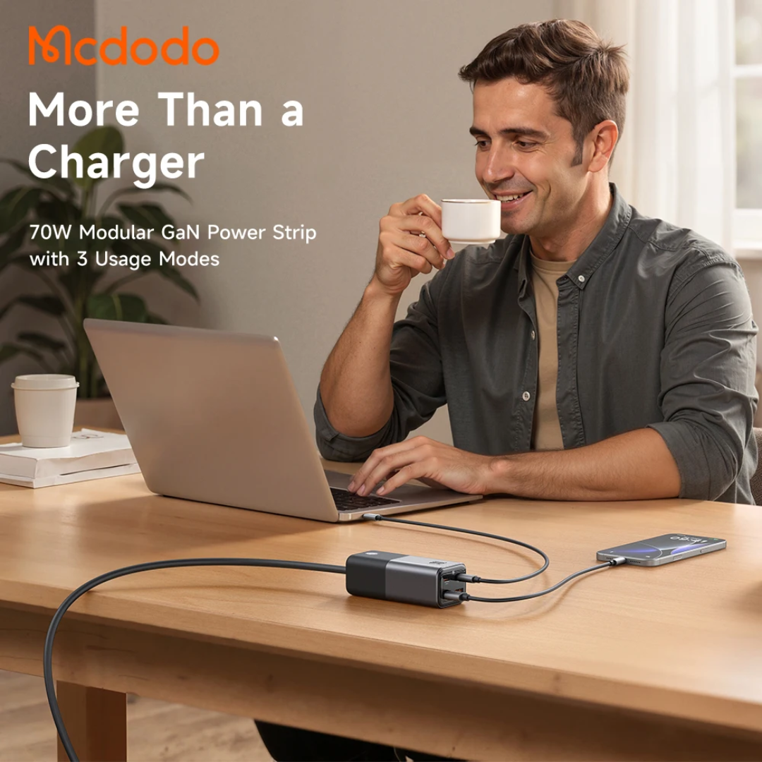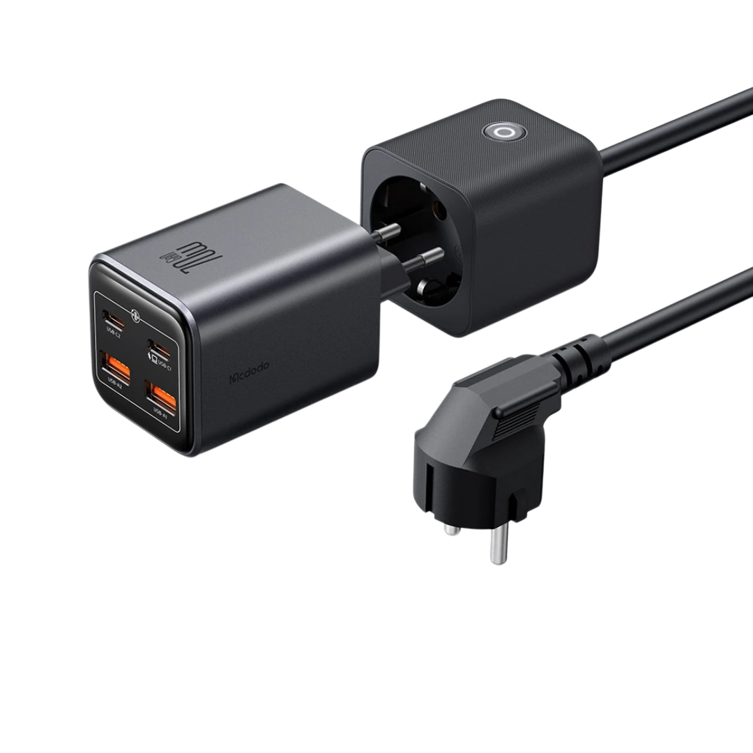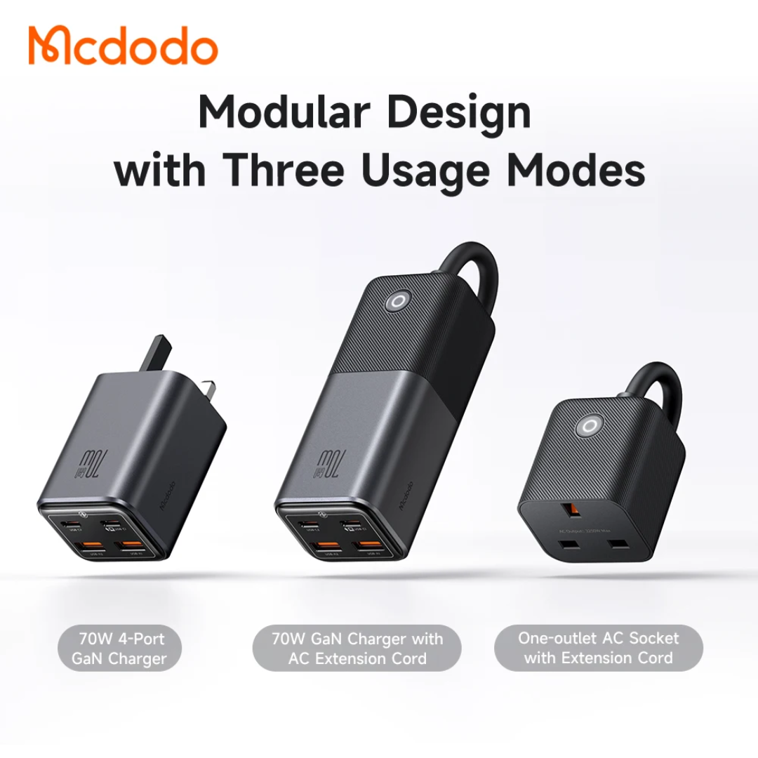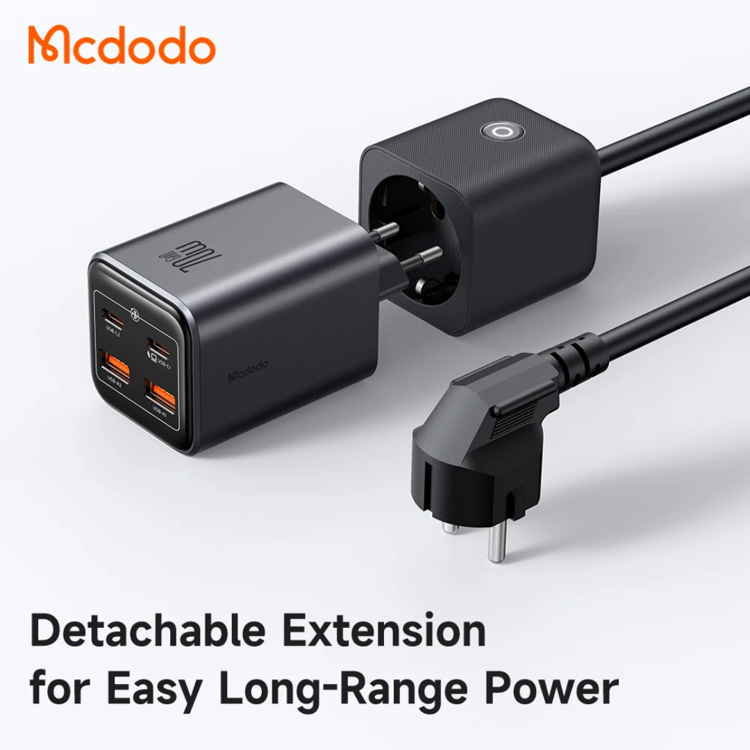 Chargeur GaN Mcdodo CH-253 70W 2C2A modulaire avec rallonge détachable 1,5 m pour prise AC. Charge simultanée jusqu’à 4 appareils (USB-C 70W max, USB-A 30W max), compact pour voyage et bureau.