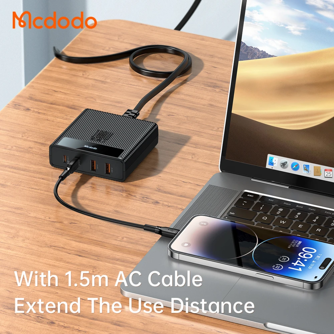 Chargeur mural Mcdodo 100W 4 ports (2 USB-C, 2 USB-A) avec technologie GaN pour une charge rapide PD jusqu’à 100W. Compatible avec allocation dynamique de puissance pour plusieurs appareils, incluant câble CA 1,5 m et câble C à C 1,2 m.