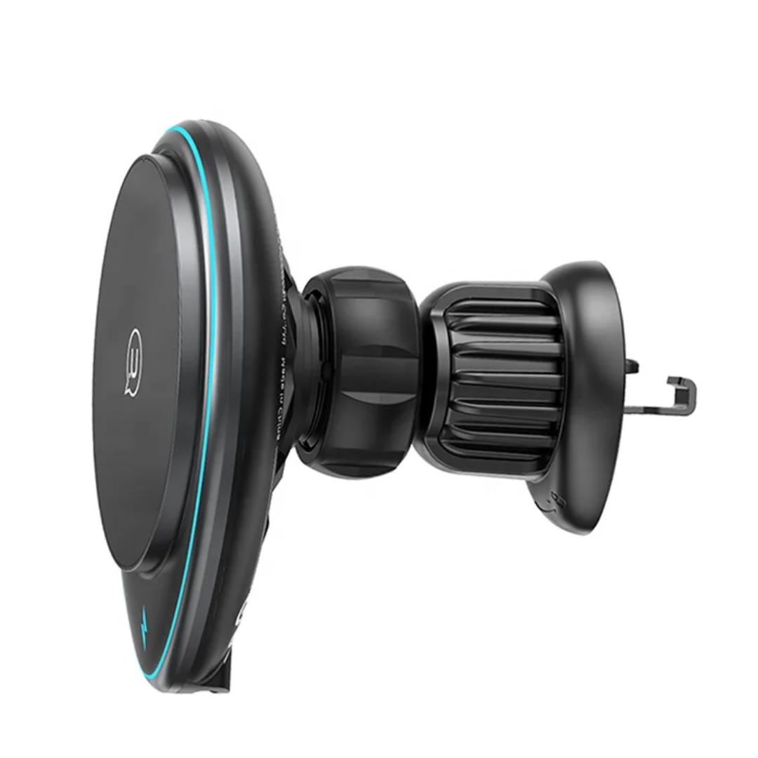 Support magnétique pour évent d’air avec charge sans fil 15W, compatible iPhone 12-15 et universel, fixation clip stable et aimants pour recharge rapide en voiture.
